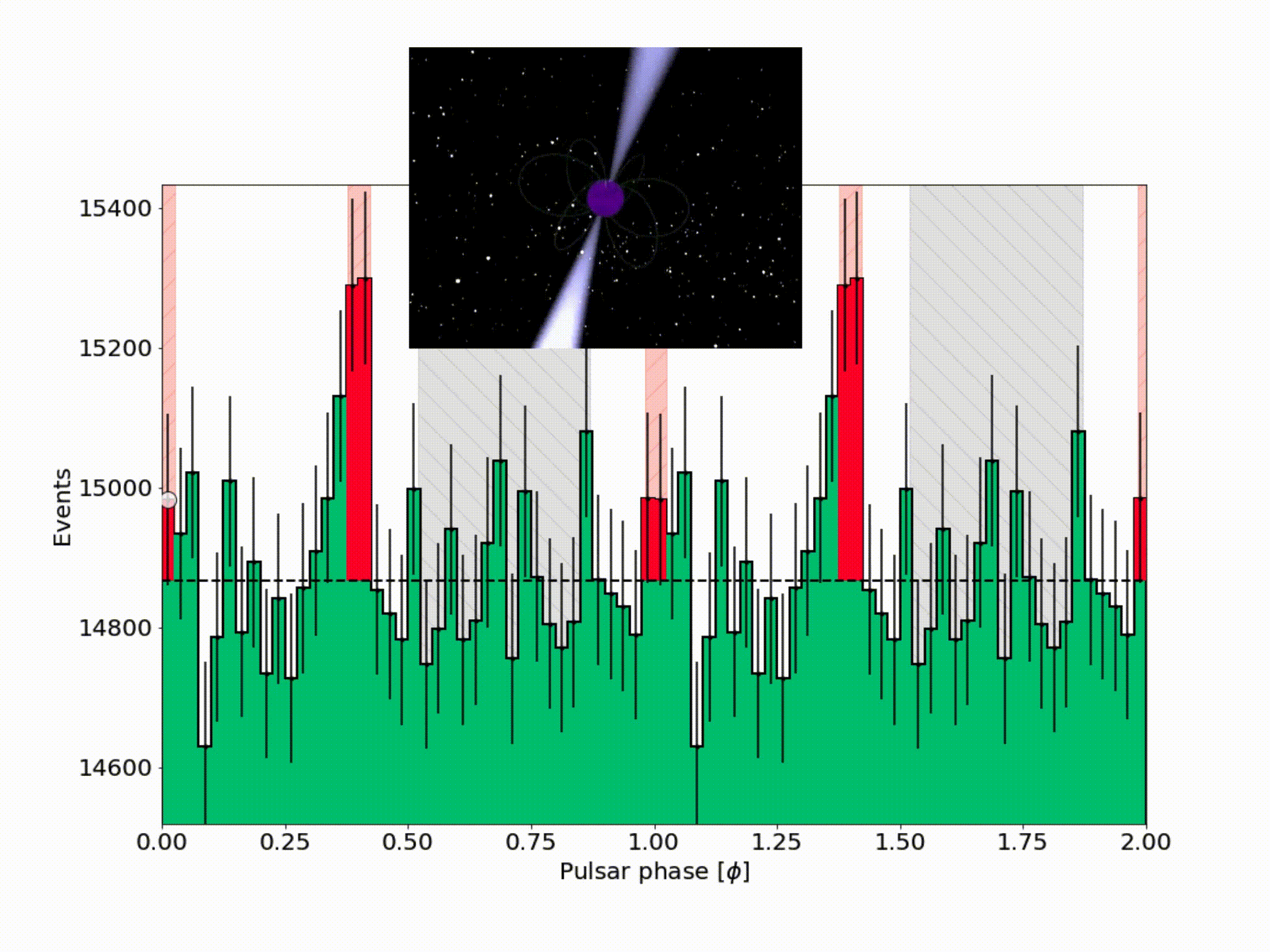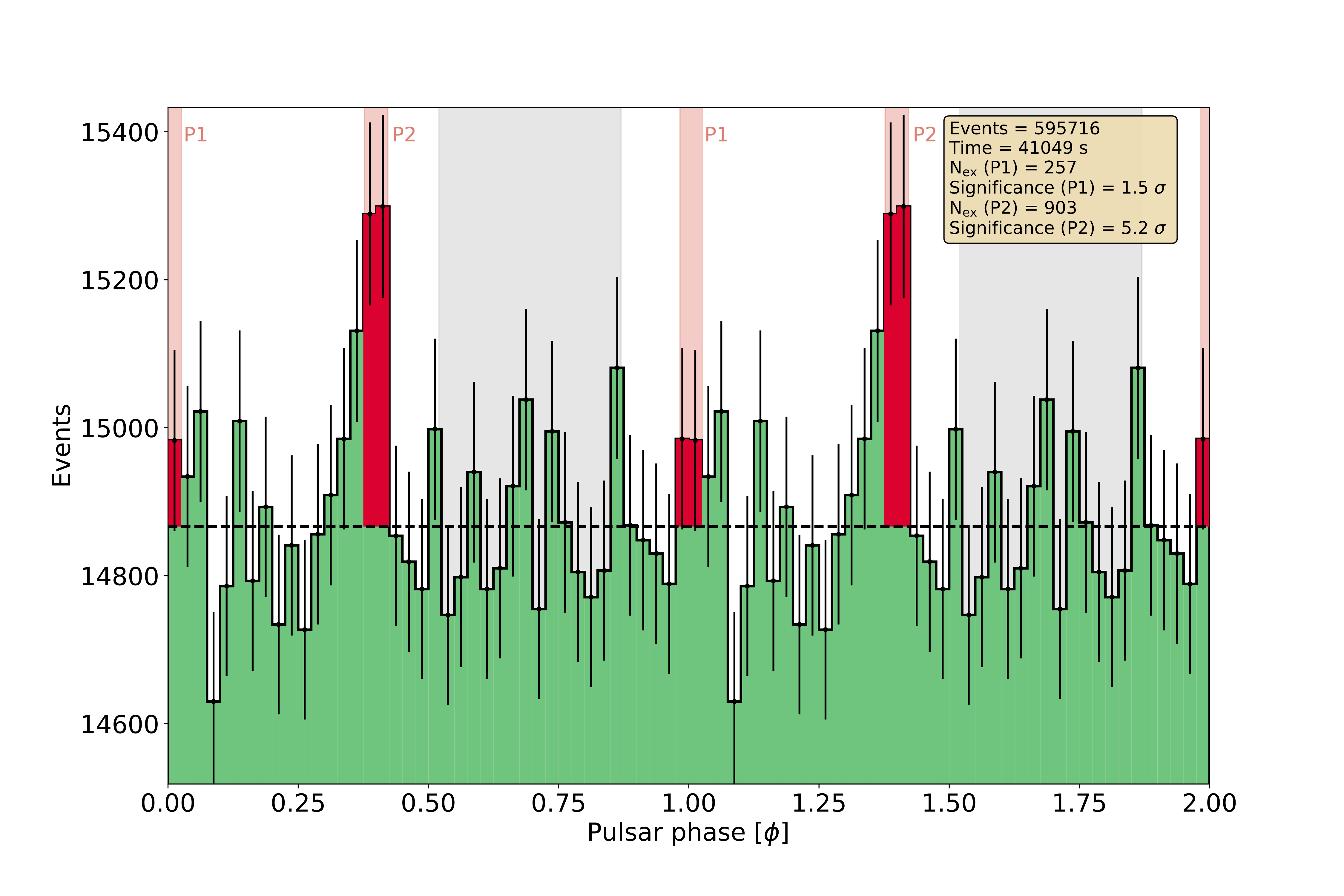 The data set collected includes 11.4 hours from eight observation nights. Figure 1 shows the resulting phasogram, plotting the gamma-ray events as a function of the pulsar rotation phase. In the phase regions marked as P1 and P2, more gamma rays are expected as the Crab pulsar emits towards the Earth. The emission detected in all phases (marked green in Figure 1) is a mixture of different background contributions, including the irreducible steady emission from the Crab Nebula. The signal detected with the LST-1 (marked red in Figure 1) is undeniably significant for phase P2, while the signal during P1 is still marginal. The animation in Figure 2 highlights the pulse behaviour of the source during the different phases.